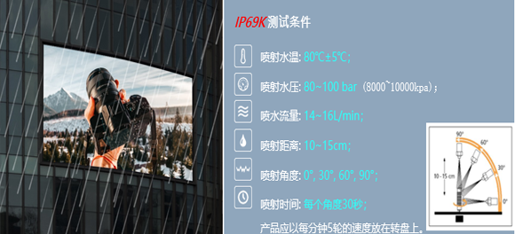 與IP65相比,IP69K是更高維度的防護(hù)測(cè)試,更貼近戶外顯示屏的實(shí)際應(yīng)用,客戶即使在鹽霧或高溫環(huán)境下也不用擔(dān)心USMⅣ的運(yùn)行狀態(tài).