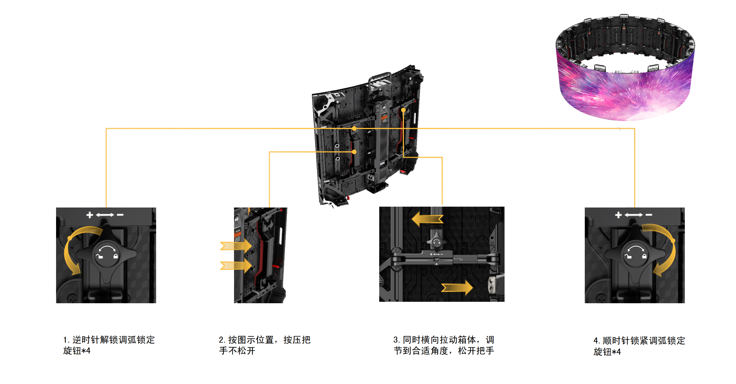 單箱13個角度調(diào)節(jié)檔位,弧度范圍±45°,僅需8個箱即可拼成最小直徑為1.27米的圓柱。